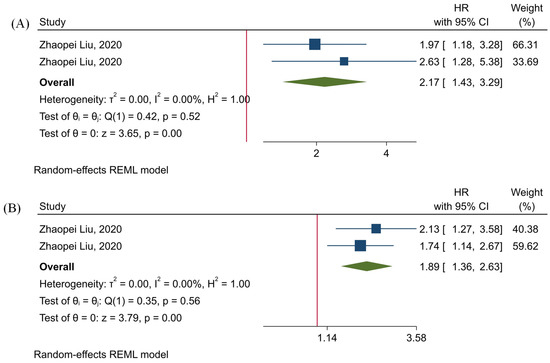 Forest plots for assessing the prognostic value of tumor-infiltrating TIGIT+CD8+ T-cells. (A) OS, and (B) RFS.