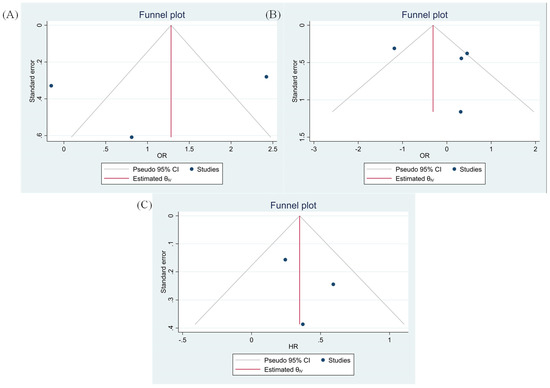 Funnel plots based on TIGIT expression (A) tumor size (Egger test p-value = 0.769 and Begg’s test p-value = 0.149), (B) tumor differentiation (Egger test p-value = 0.579 and Begg’s test p-value = 0.367) and (C) OS (Egger test p-value = 0.500 and Begg’s test p-value = 0.500).