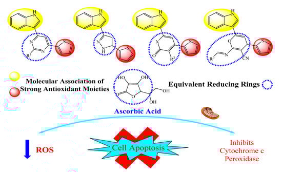 Based on the aforementioned information, we designed and synthesized a new series of promising antioxidants by choosing different reducing moieties (pyrimidines, pyrazoles, pyridines, and pyrans) which are corresponding to the reducing ascorbic acid ring and incorporating each in between two potential antioxidant moieties (indole and thiophene rings, respectively) using the molecular association approach in Figure 1.