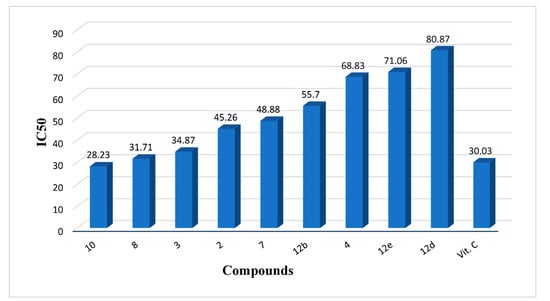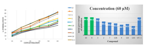 On the other hand, compounds 4, 12b, 12d, and 12e exhibited antioxidant activities but were lower than ascorbic due to the excessive aromatic rings. More aromatic rings have electron-withdrawing effects that may inhibit the activity of compounds against the free radicals. Another consequence of these aromatic rings on the activity of these compounds is increasing their lipophilicity. The lower activity of these candidates made us infer that the excessive number of free functional groups containing oxygen and nitrogen atoms, besides decreasing the number of aromatic rings, might play a significant role in the redox reaction process. The percentage of inhibition of the tested compounds, via scavenging their activities against ABTS, revealed that compound 10 achieved a mean inhibition greater than ascorbic acid over all the most different concentrations in addition to compound 8, which exhibited inhibition higher than ascorbic acid at a concentration (60 µm) as shown in Figure 3.