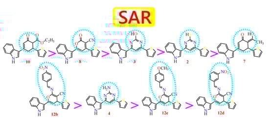 - The introduction of simple six-membered rings in the linker region in between the indole and thiophene rings (10, 8, 3, 2, and 7) was found to be superior to its attachment to chalcone moieties (12b, 4, 12e, and 12d).