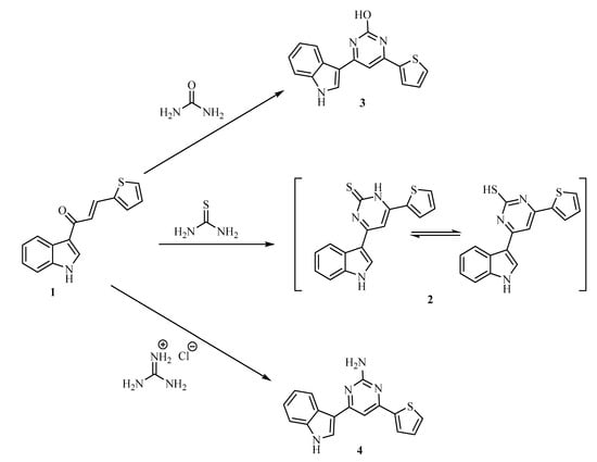 In the present approach, we aimed to synthesize novel candidates over three preparing lines. Firstly, to discover a novel series of drugs containing a pyrimidine ring with indole moieties. We utilized highly functionalized reagents as thiourea, urea, and guanidine to give 2, 3, and 4, respectively, as shown in Scheme 2. These compounds’ structures were confirmed with IR, 1H-NMR, 13C-NMR spectra and mass spectroscopy, and elemental analysis data. 4-(1H-indol-3-yl)-6-(thiophen-2-yl)pyrimidine-2-thiol (2) can be obtained by reacting thiourea with the start material under reflux for 13 h in the presence of sodium ethoxide as a base.