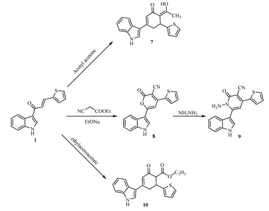 The third synthetic approach to synthesize the functional compounds (7–10) was depicted in Scheme 4. Firstly, cyclohexenes 7 and 10 were synthesized via cyclo-condensation of the chalcone 1 with different reagents in a sodium hydroxide (10%) basic medium as a catalyst. 6-(1-hydroxyethylidene)-3-(1H-indol-3-yl)-5-(thiophen-2-yl)cyclohex-2-en-1-one (7) was prepared by addition of acetylacetone to chalcone 1 in equilibrium quantities under refluxing for 5 h. Similarly, ethyl 4-(1H-indol-3-yl)-2-oxo-6-(thiophen-2-yl)cyclohex-3-ene-1-carboxylate (10) was synthesized under the same conditions but with using ethyl acetoacetate as a reagent. Whereas, the 2-pyranone ring 6-(1H-indol-3-yl)-2-oxo-4-(thiophen-2-yl)-2H-pyran-3-carbonitrile (8) was synthesized through the reaction of chalcone 1 with ethyl cyanoacetate in the presence of sodium ethoxide as a catalyst at room temperature. Treatment of compound 8 with hydrazine hydrate under refluxing for 6 h converted the pyranone ring to 2-pyridone to give 1-amino-6-(1H-indol-3-yl)-2-oxo-4-(thiophen-2-yl)-1,2-dihydropyridine-3-carbonitrile (9). The structures of compounds 7, 8, 9, and 10 were elucidated by IR, 1H-NMR, 13C-NMR spectra, and mass spectroscopy, also elemental analysis (For further illustration, see experimental part).