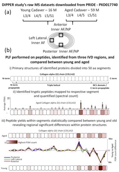 Experimental design for the application of PLF to three distinct regions of young and aged IVDs. (a) Raw LC–MS/MS datasets (from two males, one young [16 years old] and one aged [59 years old]), corresponding to the posterior inner AF/NP, left lateral inner AF and anterior inner AF/NP regions of the L3/4, L4/5 and L5/S1 lower lumbar IVDs were downloaded from the PRIDE repository (PXD017740) []. (b) After MS/MS peptide identification, the MPLF webtool [] was used to perform PLF on the identified peptides and compare peptide yields across protein structures between young and aged discs—three vs. three discs for anterior and left lateral datasets and three vs. two discs for posterior datasets (the young anterior L4/5 disc was omitted from the analysis due to the insufficient number of identified peptides for PLF analysis). As previously described [], ((b), i) proteins were divided into 50-amino acid (aa)-sized segments; the collagen I α2 chain (COL1A2) is shown here as an example. ((b), ii) Peptides were mapped to their respective segments, summed, normalised between aged and young groups based on the median whole protein spectrum count and averaged for each group (average peptide spectrum match [PSM] count per segment). ((b), iii) Peptide yields in each segment were statistically compared between young and aged IVDs using an unpaired, Bonferroni-corrected, repeated-measures ANOVA (* p ≤ 0.05; *** p ≤ 0.001). To visualise these differences along the protein structure, average PSM counts per segment in the young group were subtracted from those in the aged one and compared between posterior, left lateral and anterior IVD regions.