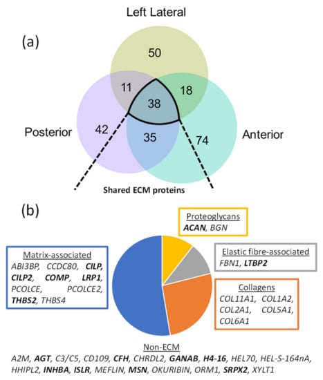 ECM-associated proteins make up half of the proteins identified with significant, age-associated structural differences in all three IVD regions. PLF revealed 126 proteins in posterior (Table S4), 117 in left lateral (Table S5) and 165 in anterior (Table S6) IVD regions with significant differences in peptide yield between aged and young IVDs, across their structures. (a) Of these, 38 were shared between the three regions. (b) Classification of these shared proteins revealed ECM as the major class, which included several ECM-associated proteins, collagens, two elastic fibre-specific proteins and two proteoglycans. The affected proteins which were uniquely discovered by PLF and not by label-free quantification of abundance in the DIPPER study [] (Figure S3) are highlighted in bold.