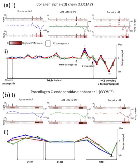 COL1A2 and PCOLCE protein structures exhibit differences in peptide yield patterns between young and aged proteins, which were conserved in posterior, left lateral and anterior IVD regions. PSMs were summed in each 50-aa protein segment, normalised and averaged for young and aged groups (bar graphs = average, normalised PSMs, error bars = standard deviation). Average PSMs per segment in young were subtracted by those in aged and divided by segment aa length (50) to reveal fluctuations in peptide yield along protein structures (line graph y axes = aged–young PSM counts/segment length, normalised between tissue regions in composite graphs; * p ≤ 0.05; ** p ≤ 0.01; *** p ≤ 0.001, Bonferroni-corrected, repeated-measures ANOVA; black * in composite line graph = significant in all three IVD regions; functional domains, sourced from UniProt, are indicated). ((a), i) Several COL1A2 segments exhibited significant differences in peptide yield between young and aged samples within the C-terminal half of the protein (blue line: posterior, green: left lateral, red: anterior). ((a), ii) Crucially, these differences in peptide yield along the COL1A2 structure are markedly consistent between all the three regions, with a similarly higher peptide yield displayed in segment 20 of aged compared to young and lower peptide yield in the last three segments, nearest to the C-terminus. ((b), i) The last 50-aa segment on the C-terminal end of PCOLCE also exhibited a significantly lower peptide yield in aged compared to young for the inner AFs of all three IVD regions. ((b), ii) Peptide yield difference patterns along the primary structure were also similar between all the three regions, with a consistently higher peptide yield in aged compared to young measured on the N-terminal side of the protein followed by a lower yield in the last two segments near the C-terminal end.