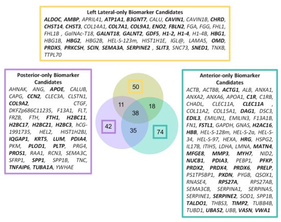 A sub-population of IVD proteins showed significant differences in structure which were region-specific (42 for posterior, 50 for lateral and 74 for anterior) between young and aged samples (Figure 4). These proteins included several prominent ECM components such as tenascin (TNC) and proteoglycan 4 (PRG4) (exclusive to posterior), collagen XIV α1 (COL14A1) and osteomodulin (OMD) unique to left lateral) and EMILIN-1 (EMILIN1) and nidogen 2 (NID2) (exclusive to anterior) (Figure S5).