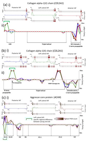 Importantly, some proteins even displayed differences in peptide yield between young and aged samples, which were shared between all AF regions (Figure 2b) on one side of their protein structures but region-specific on the other side, as seen for collagen V α1 (COL5A1), collagen II α1 (COL2A1) and aggrecan core protein (ACAN) (Figure 5). For COL5A1, a characteristic significant decrease in peptide yield in aged compared to young samples, followed by an increase, can be seen in the C-terminal end, along the primary structure, which remains consistent for all three IVD regions (Figure 5a). This is similar also for COL2A1, which exhibited the same significant rise and fall in peptide yield along its chain in all three IVD regions, on its C-terminal side (Figure 5b). However, both α1 chains of collagens V and II displayed additional N-terminal, significant increases in peptide yield in aged compared to young samples that were lateral-specific (green brackets in Figure 5a,b(ii)). Contrastingly, a significantly higher peptide yield was observed near the N-terminal end of aged aggrecan than in the young one, for both the posterior and the anterior inner AF regions (Figure 5c). However, this pattern was reversed for left lateral, with the same protein region yielding significant lower peptide counts in aged aggrecan than in young aggrecan (green bracket in Figure 5c(ii)).