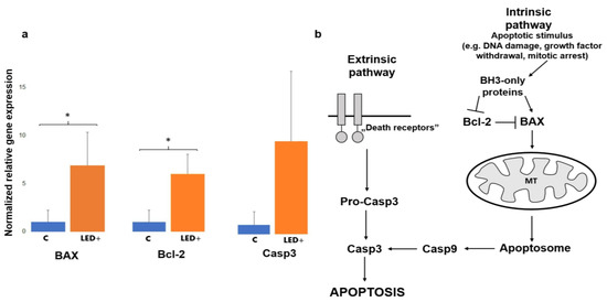 Bax, Bcl-2, and Casp3 gene expression in the retina of control and LED-treated mice. (a) Histograms show the relative mRNA expression of Bax, Bcl-2, and Casp3 as measured in control (normalized to 1) and LED-treated mice (n = 8, 4 control, 4 LED +). (* p = 0.05; pCasp3 = 0.1). (b) The main players of apoptosis. Casp3 is the link between intrinsic and extrinsic pathways, while Bcl-2 has a role in survival.