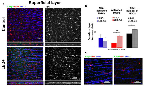 Microglia activation in the superficial layer (inner retina GCL). Panel (a) shows the ganglion cell layer of control and LED retinas labeled SMI32 (GC marker), Iba1 (MG marker), and Casp3 (Casp3+ cells). The colors shown are the same as the colors above the images. In the second column, only Iba1-labeled microglia are shown in white. In panel (b) the histogram shows the number of non-activated, activated, and total microglia counted in the SL (* p = 0.05; ** p = 0.01). (c) Shows high-magnification confocal microscopic images scanned with a 63× objective of activated MGs (left) and non-activated MGs (right).