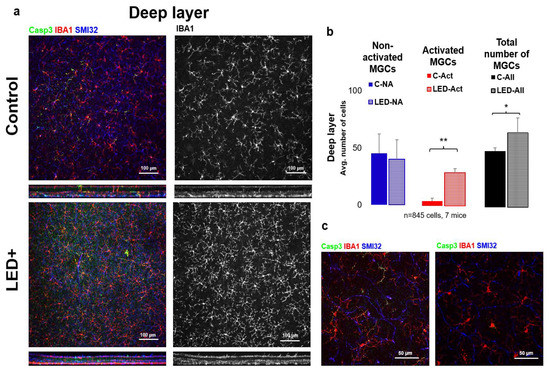Microglia activation in the deeper parts of the retina. Panel (a) of the figure shows the outer or “deep” layer of control and LED retinas, labeled with SMI32 (neuron marker), Iba1 (microglia marker), and Casp3 (Casp3 + cells) scanned with a 20× objective (pictured). The colors shown are the same as the colors above the images. In the second column, only Iba1-labeled microglia are shown in white. In (b) the histogram shows the number of inactivated, activated, and total microglia counted in the retinal ganglion cell layer and inner fibrous layer (* p = 0.05; ** p = 0.01). (c) Shows confocal microscopic images scanned with a 63× objective of activated MGs (left) and non-activated MGs (right).
