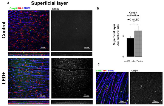 Casp3 activation in the superficial layer. Panel (a) shows the ganglion cell layer of control and LED retinas labeled SMI32 (GC marker), Iba1 (MG marker), and Casp3 (Casp3+ cells) scanned with a 20× objective in a confocal microscope. The colors shown are the same as the colors above the images. In the second column, only Casp3-labeled cells are shown in white. In panel (b) the histogram shows the number of Casp3-activated cells in the SL (* p = 0.05). Panel (c) shows high-magnification confocal microscopic images scanned with 63× objective of Casp3+ areas in MG.