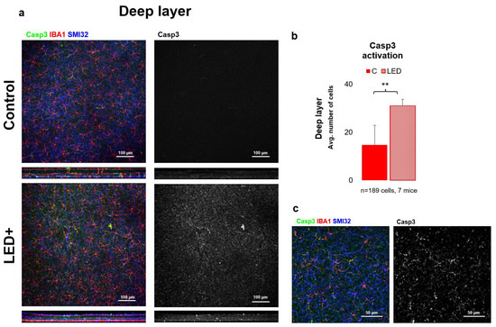 Casp3 activation in the deeper parts of the retina. Panel (a) of the figure shows the outer core layer of control and LED retinas labeled SMI32 (GC marker), Iba1 (MG marker), and Casp3 (Casp3+ cells) scanned with a 20× objective in a confocal microscope. The colors shown are the same as the colors above the images. In the second column, only Casp3-activated cells are shown in white. In panel (b) the histogram shows the number of activated cells counted in the DL (** p = 0.01). Panel (c) shows high-magnification confocal microscopic images scanned with a 63× objective. The triple-labeled and only Casp3-activated cells are visible from the LED retinas.