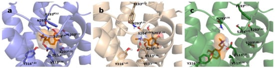 - Wacker, D.; Fenalti, G.; Brown, M.A.; Katritch, V.; Abagyan, R.; Cherezov, V.; Stevens, R.C. Conserved binding mode of hu-man beta2-adrenergic receptor inverse agonists and antagonist revealed by X-ray crystallography. J. Am. Chem. Soc. 2010, 132, 11443–11445. [Google Scholar] [CrossRef] [PubMed] [Green Version]
