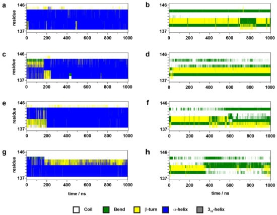 - Kabsch, W.; Sander, C. Dictionary of protein secondary structure: Pattern recognition of hydrogen-bonded and geometrical features. Biopolymers 1983, 22, 2577–2637. [Google Scholar] [CrossRef]