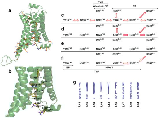 - Ballesteros, J.A.; Jensen, A.D.; Liapakis, G.; Rasmussen, S.; Shi, L.; Gether, U.; Javitch, J. Activation of the β2-Adrenergic Receptor Involves Disruption of an Ionic Lock between the Cytoplasmic Ends of Transmembrane Segments 3 and 6. J. Biol. Chem. 2001, 276, 29171–29177. [Google Scholar] [CrossRef] [PubMed] [Green Version]