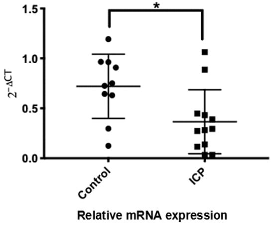 Comparative mRNA levels of SLCO3A1 in healthy and ICP placentae. Circle symbols represent healthy control placentae, and square symbols represent intrahepatic cholestasis of pregnancy (ICP). Real-time quantitative PCR and statistical evaluations of data are as described in the Section 5. * p = 0.0177.