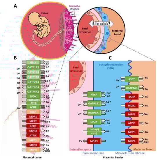 There is accumulating evidence linking the toxicity of BAs to adverse fetal and maternal outcomes. Therefore, the BA equilibrium within the maternal–fetal pool, which necessarily depends on a balanced BA transport across the placental barrier, is critical. In healthy pregnancies, the concentration of BAs is higher in the fetal than in the maternal circulation []. Therefore, vectorial transfer of BAs across the placenta mainly occurs from fetus to mother []. The transport from fetus to trophoblast is primarily mediated by anion/BA exchangers, whereas the transport from trophoblast to mother especially occurs via ABC transporter proteins, comparable to BA uptake and efflux in hepatocytes. In ICP, the transplacental gradient for BAs is reversed. Consequently, the net transport of BAs is directed towards the fetus, rather than being transported to the maternal side []. Surprisingly, fetal BAs are raised to a lesser extent than maternal BAs, implying a protective mechanism that limits BA uptake into the fetal circulation and/or enhances ATP-dependent carriers that transport against concentration gradients towards the maternal circulation []. Since the placenta is a vital organ, which plays a key role in fetal protection, it could be assumed that it would prevent fetal exposure to greater amounts of endobiotic toxic compounds, such as BAs. Although the exploration of human placental BA transport systems is clinically relevant, experimental studies reporting the placental gene expression of BA transporters and carriers are scarce or even lacking. This is particularly noticeable for transporters such as the solute carrier (SLC) family 10 member 2 (SLC10A2, also known as apical sodium-dependent bile acid transporter (ASBT)), epoxide hydrolase 1 (EPHX1, known in hepatic tissue as epoxide hydrolase (EPOX)), solute carrier organic anion transport protein 3A1 (SLCO3A), ATP8B1, ABCB11, and ABCB4 in health and disease conditions. An overview of currently known SLC and ABC transporters associated with BA transport is presented in Table 1.