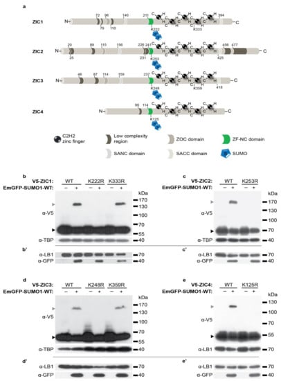 - Chen, L.; Ma, Y.; Qian, L.; Wang, J. Sumoylation regulates nuclear localization and function of zinc finger transcription factor ZIC3. Biochim. Biophys. Acta—Mol. Cell Res. 2013, 1833, 2725–2733. [Google Scholar] [CrossRef]