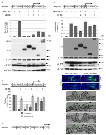 - Pourebrahim, R.; Houtmeyers, R.; Ghogomu, S.; Janssens, S.; Thelie, A.; Tran, H.T.; Langenberg, T.; Vleminckx, K.; Bellefroid, E.; Cassiman, J.J.; et al. Transcription factor Zic2 inhibits Wnt/Beta-catenin protein signaling. J. Biol. Chem. 2011, 286, 37732–37740. [Google Scholar] [CrossRef] [PubMed]