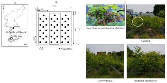 - Won, S.-J.; Kwon, J.-H.; Kim, D.H.; Ahn, Y.S. The effect of Bacillus licheniformis MH48 on control of foliar fungal diseases and growth promotion of Camellia oleifera seedlings in the coastal reclaimed land of Korea. Pathogens 2019, 8, 6. [Google Scholar] [CrossRef] [PubMed] [Green Version]