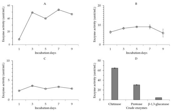 2.1.2. Chitinase, Protease, and β-l,3-Glucanase Activity in the Culture Broth and Crude Enzyme of Bacillus Velezensis CE 100