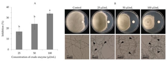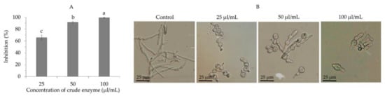 2.1.3. Activity of Crude Enzyme from Bacillus velezensis CE 100 against Spore Germination and Mycelial Growth of Colletotrichum Gloeosporioides