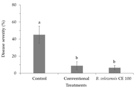 | B. velezensis CE 100 | 44.6 ± 1.7 a | 227.6 ± 41.3 a | 57.2 ± 8.4 a | 1193.3 ± 200.5 a |