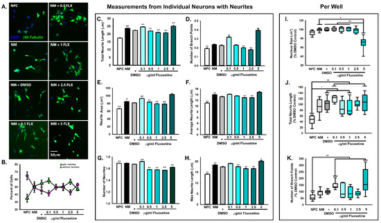 Effects of fluoxetine on neurite formation. (A) Human induced pluripotent stem cell derived neural progenitor cells were differentiated into neurons for 24 h in the presence of increasing concentrations of fluoxetine (FLX) before fixation and immunostaining with the neuronal marker, βIII-Tubulin and DAPI. As a control, cells were maintained in neural progenitor cell media. Cells were imaged and analyzed on the automated high content imaging system, and the experiment was performed in triplicate. Scale bar = 50 μm. (B) Analysis of the percentage of βIII-tubulin-positive cells with or without neurites. Note that while some NPCs express βIII-tubulin after 24 h of attachment at low-density to laminin-coated plates, the majority do not express neurites. (C–H) In the βIII-tubulin-positive cells with neurites, we analyzed total neurite length per neuron (C), branch points (D), neuron area (E), average neurite length (F), number of neurites per neuron (G), and max neurite length per neuron (H). n of βIII-tubulin-positive cells with neurites = 11,044 NPC, 15,723 NM, 18,522 DMSO, 17,224 0.1 FLX, 22,227 0.5 FLX, 23,015 1 FLX, 22,775 2.5 FLX, and 5489 5 FLX. For (C–H), data is presented as the mean + standard error. (I–K) Nucleus size and neurite parameters, including total neurite length and number of branch points, were also analyzed for the entire βIII-tubulin-positive population per well. n = 9 wells total for all conditions, except for 0.1 μg/mL, which was analyzed in 8 wells, due to low neuron count in one well. * p ≤ 0.05, ** p ≤ 0.005, one-way ANOVA. For (C–H), significant differences show for comparison with DMSO control. All comparisons reported in Supplemental Materials.