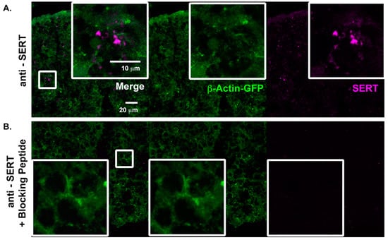 Human cortical spheroids express the serotonin transporter SERT. (A) 3-month-old untreated cortical spheroids were immunostained with the SERT antibody or (B) the SERT antibody together with the blocking peptide to evaluate antibody specificity. Endogenous β-actin-GFP (green) and immunostained SERT (magenta) were imaged with confocal microscopy under identical conditions. Scale bar = 10, 20 μm.