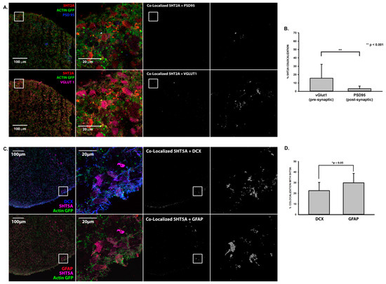 We have previously demonstrated that human cortical spheroids are an ideal model to observe and manipulate synapse formation of developing neural networks [3,36,46,47]. Before we treated cortical spheroids with fluoxetine, we examined whether cortical spheroids appropriately express SERT, which is targeted by fluoxetine, and serotonin receptors, independent of serotonergic innervation from the dorsal and medial raphe nuclei. Embryonic and early post-natal brain development is associated with transient forebrain expression of SERT in cortical pyramidal neurons [48,49,50]. We have previously demonstrated that human cortical spheroids capture the fetal localization of other signaling pathways, such as endocannabinoid pathways [47]. To determine whether cortical spheroids capture the early developmental-specific expression of SERT, we immunostained for SERT in three-month-old human cortical spheroids (Figure 2A). To verify the specificity of SERT immunostaining, we also immunostained in the presence of the soluble peptide antigen, which prevented fluorescent labeling of the sample (Figure 2B), demonstrating specificity of the SERT antibody. We also examined whether common cortical serotonergic receptors exhibit an appropriate localization. The serotonergic receptor 5-HT2A is one of the most highly expressed serotonergic receptors of the cortex, where It localizes to excitatory synapses [24]. 5-HT2A co-localized with VGLUT1 and PSD95 in excitatory synapses, although it predominantly localized to pre-synaptic VGLUT1-positive compartments (Figure 3A,B). Furthermore, the serotonin receptor 5-HT5A, is preferentially expressed by glial cells (Figure 3C,D), as has been previously described in the rodent cortex [51]. Thus, despite lacking serotonergic innervation, cortical spheroids appropriately express SERT and serotonin receptors.