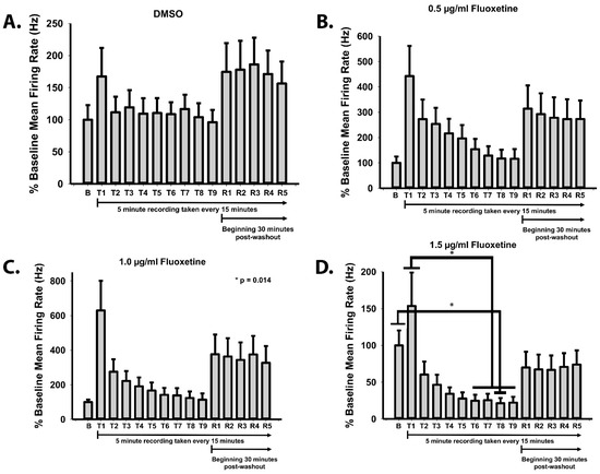 To determine the effects of fluoxetine on electrical neuronal activity, microelectrode array (MEA) technology was used to record the effects of the drug. For this portion of the project, the Maestro Edge (Axion BioSystems) was used to record the changes in electrical field potentials corresponding to spontaneous action potentials. Prior to experimentation, a baseline recording was taken to establish the control rate of spontaneous action potential firing. Following the baseline recording, the solvent DMSO and three concentrations of fluoxetine (0.5 μg/mL, 1.0 μg/mL, and 1.5 μg/mL) were individually added to each row on the 24-well MEA plate and the effects on spontaneous action potential firing rate were recorded for 5 min every 15 min for 2 h. Following the two-hour recording period, the drug was washed out. We initiated a new recording schedule 30 min post-washout. We analyzed mean firing rate, which corresponds to the number of spikes that occur over the duration of the 5-min recording. Notably, the addition of fresh media with treatment results in an initial spike in activity. For the DMSO control, the mean firing rate was not found to be significantly different during any of the treatment or recovery recordings when compared to baseline (Figure 4A). Apart from the initial spike in activity, neither treatment with 0.5 nor 1 μg/mL fluoxetine significantly impacted the mean firing rate (Figure 4B,C). However, 1.5 μg/mL fluoxetine significantly decreased the mean firing rate (Figure 4D), although this concentration did not impact excitatory synapse formation (Figure 4). The decrease in firing rate was reversible, and the normal firing rate was restored with the drug washout (Figure 4D).