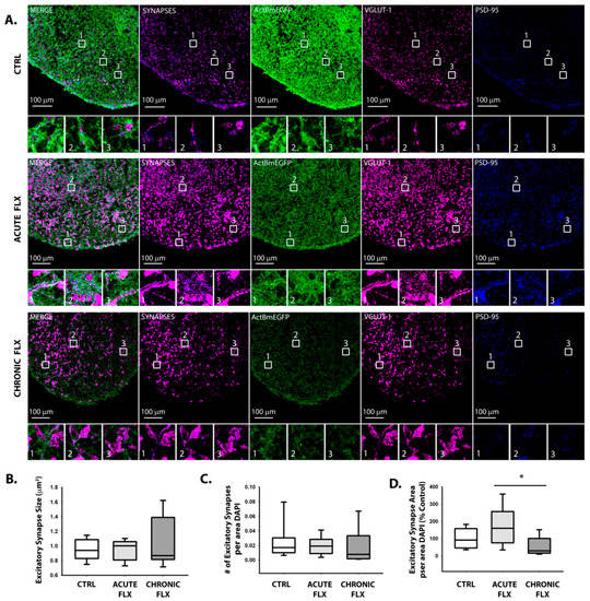 To determine the effects of fluoxetine on synapse formation, human-derived cortical spheroids were either acutely or chronically treated with fluoxetine. For acute treatment, 1.5 μg/mL fluoxetine was added overnight to three-month-old cortical spheroids. We have previously shown that acute pharmacological treatment is sufficient to alter synapse formation [36,46,47]. In contrast, for chronic treatment, fluoxetine was added for a month and half, when cortical spheroids are being cultured in neuronal maintenance media so as to not interfere with preceding events of neural differentiation and migration. We chose the concentration of 1.5 μg/mL fluoxetine given that this dose alters synapse function (Figure 4), but does not produce cytotoxic effects, such as those observed at 5 μg/mL fluoxetine (Figure 1). After three months of culture, the cortical spheroids were cryosectioned and immunostained for excitatory synaptic markers, VGLUT1 and PSD95. To identify excitatory synapses, we analyzed co-localization of the pre-synaptic marker VGLUT1 and post-synaptic PSD-95 (Figure 5A). There were no significant changes in excitatory synapse formation in comparison to control spheroids, although there was a significant difference in the area occupied by excitatory synapses in acute vs. chronically treated spheroids, with acute spheroids exhibiting more excitatory synapse area (Figure 5D). Thus, while we observed a trend towards an increased area occupied by excitatory synapses in cortical spheroids acutely treated with fluoxetine (Figure 5D), there were no significant changes in the size of individual excitatory synapses (Figure 5B) or density of excitatory synapses (Figure 5C).