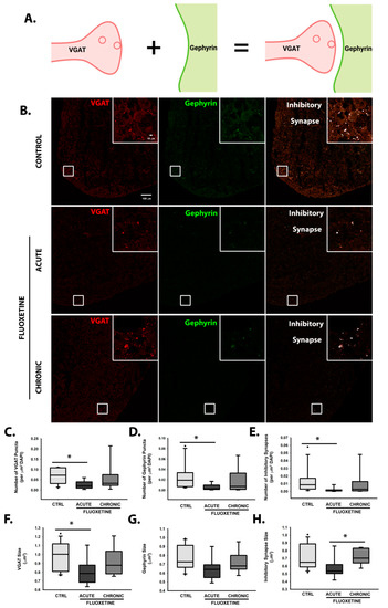Acute, but not chronic, fluoxetine alters inhibitory synapse formation. (A) Schematic of inhibitory pre- (VGAT-positive) and post- (gephyrin-positive) synaptic compartments. Image created using lab-licensed Biorender account. (B) 3-month-old cortical spheroids were either acutely or chronically treated with 1.5 μg/mL fluoxetine. 10 μm-thick cryosections were immunostained for inhibitory synapse markers, pre-synaptic VGAT (red) and post-synaptic gephyrin (green) and were imaged using confocal microscopy. Scale bar = 10, 100 μm. (C–H) Individual pre- (VGAT+) and post- (gephyrin+) synaptic markers, as well as co-localization between pre- and post-synaptic markers were analyzed to determine the size and density of inhibitory synapses per cryosection. A threshold of 0.001 synapses per μm2 DAPI was used for inclusion in the study. n = 12 cryosections from 4 independent cortical spheroid cultures for the untreated control, 9 cryosections from 3 independent cortical spheroid cultures for acute FLX, and 9 cryosections from 3 independent cortical spheroid cultures for chronic FLX. * p < 0.05, One-way ANOVA.