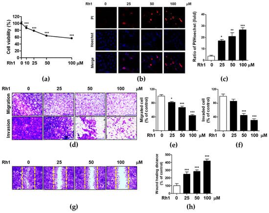 The cytotoxic effect of Rh1 on MDA-MB-231 cells was evaluated using MTT and propidium iodide (PI) staining assays. Cells were treated with different doses of Rh1 for 24 h. Rh1 significantly inhibited the viability of MDA-MB-231 (Figure 1a). PI staining indicates apoptotic cells by staining damaged nuclei. Rh1 significantly increased the number of apoptotic cells from 25 μM compared to non-treated cells (Figure 1b,c). Thereafter, we investigated the inhibitory effects of Rh1 on the migration and invasion of MDA-MB-231 cells. Rh1 treatment strongly suppressed cell migration and invasion in a dose-dependent manner (Figure 1d–f). In the invasion assay, Rh1 significantly suppressed the cell invasive capacity at 50 μM Rh1 (Figure 1d, bottom panel, and Figure 1f). Rh1 treatment significantly decreased wound healing ability in a dose-dependent manner in MDA-MB-231 cells (Figure 1g,h). These results indicate that Rh1 has a superior ability to regulate cancer cell wound healing, migration, and invasion in MDA-MB-231 cells.