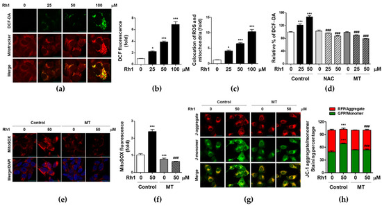 Intracellular ROS production has been reported to be related to various stresses. ROS affects cell apoptosis, migration, and invasion, which are generated by mitochondrial metabolism [25]. To elucidate whether Rh1 modulates the production of ROS in MDA-MB-231 cells, cells were treated with various concentrations of Rh1 for 24 h. Thereafter, ROS levels were analyzed by DCF-DA staining. Rh1 treatment significantly increased ROS accumulation in a dose-dependent manner in MDA-MB-231 cells (Figure 3a, upper panel, and Figure 3b). Next, we investigated mitochondrial morphological changes that divided fission and fusion (Figure 3a, middle panel). Mitochondrial fission plays an important role in disorder-associated processes, such as mitochondrial dysfunction, autophagy, and apoptosis. As shown in the Figure 3a middle panel, Rh1 increased the colonic shape, indicating mitochondrial fission. In addition, Rh1 induced ROS generation, which overlapped with morphological changes in mitochondrial fission (Figure 3c). In addition, Rh1-induced ROS production was inhibited by NAC, an ROS scavenger and Mito-TEMPO (MT), mtROS inhibitor (Figure 3d). MitoSox staining assay revealed that Rh1 significantly induced mtROS generation, whereas 5 μM MT treatment elicited the opposite effect (Figure 3e,f). Rh1-induced mtROS production was associated with mitochondrial damage as determined by the JC-1 assay (Figure 3g,h). Rh1 induced the fluorescence intensity of J-monomer in a dose-dependent manner, but MT treatment inhibited Rh1-induced mitochondrial membrane disruption. In summary, the results suggest that Rh1 induced apoptosis by the production of mtROS.