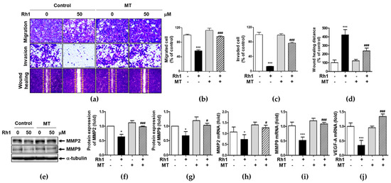 To determine the effect of Rh1-induced mtROS on cell migration and metastasis, cells were pretreated with 5 μM MT for 1 h followed by treatment with 50 μM Rh1. MT significantly suppressed Rh1-inhibited migration of MDA-MB-231 cells (Figure 4a, upper panel, Figure 4b,d). Consistent with the migration data, treatment with MT significantly sustained Rh1-inhibited invasion (Figure 4c). This suggests that Rh1 inhibited migration and invasion via the induction of mtROS production in MDA-MB-231 cells. In addition, Rh1 treatment inhibited expression of MMP2 and MMP9, whereas MT strongly suppressed Rh1 effects (Figure 4e–g). Consistently, Rh1-inhibited MMP2, MMP9, and VEGF-A expression was suppressed by the MT treatment (Figure 4h–j). These results show that Rh1 inhibited expression of MMP2, MMP9, and VEGF-A by the production of mtROS.