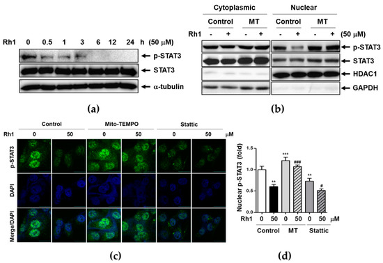 Rh1 inhibited STAT3 activation via inducing mtROS. (a) MDA-MB-231 cells were treated with 50 μM Rh1 for indicated time intervals. (b) MDA-MB-231 cells were pretreated with 5 μM MT for 1 h followed by treatment with 50 μM Rh1 for 30 min. After fractionation, protein localization was evaluated by western blot analysis. (c,d) MDA-MB-231 cells were pre-treated with 5 μM MT or 1 μM stattic followed by treatment with 50 μM Rh1 for 30 min. After treatment, cells were subjected to immunofluorescence staining, and p-STAT3 expression in cells was observed using a laser scanning confocal spectral microscope. The fluorescence intensity was measured using an Image J software and indicated as fold change compared to the control (0) sample. The scale bar indicates 30 μm. The data are presented as means ± SEM (n = 3). ** p < 0.01 or *** p < 0.001 vs. control. # p < 0.05 or ### p < 0.001 compared with each inhibitor alone.