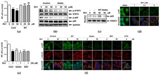 To investigate whether Rh1-mediated mtROS regulates NF-κB promoter activity, another major metastatic marker, MDA-MB-231 cells were co-transfected with NF-κB-Luc and pRL-TK plasmids and luciferase activity in the cell extracts was using a dual-luciferase reporter assay system. As shown in Figure 6a, Rh1 significantly inhibited NF-κB-Luc activity in a dose-dependent manner, whereas MT treatment significantly inhibited Rh1’s effects on NF-κB-Luc activity (Figure 6a). A previous report suggested that p-STAT3 can bind to p65, one of the subunits of NF-κB to promote the NF-κB-mediated signaling pathway [27]. To investigate the relationship between STAT3 and NF-κB activation, cells were pretreated with 1 μM stattic for 1 h followed by treatment with 25 and 50 μM Rh1 for 30 min. Rh1 inhibited both STAT3 and p65 phosphorylation, and stattic co-treatment further decreased both protein activation (Figure 6b). When mtROS was blocked by MT treatment, the inhibitory effect of Rh1 on p65 translocation into nucleus was reversed, whereas stattic treatment further inhibited p65 translocation (Figure 6c), suggesting the role of mtROS-deactivated STAT3 in p65 translocation. P-p65 NF-κB translocation was examined by immunofluorescence assay after treatment with BAY and found that BAY completely blocked p65 NF-κB translocation into the nucleus at a concentration 1 μM (Figure 6d). Interestingly, inhibition of STAT3 or NF-κB activation by stattic or BAY 11-7082 (BAY) induced the deactivation of NF-κB-Luc as much as Rh1 treatment (Figure 6e). We confirmed the effect of Rh1-induced mtROS and STAT3 deactivation on p-p65 translocation using immunofluorescence assay. Consistent with the results shown in Figure 6c, p-p65 translocation was completely blocked by Rh1 co-treatment with stattic or BAY, whereas MT pretreatment abolished Rh1’s effects on p-p65 translocation (Figure 6f).