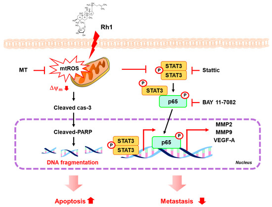 STAT3 signaling pathway is a key molecular mechanism involved in a variety of cancer metastasis and tumorigenesis [12,19,28]. A previous study reported that excessive ROS production induces cancer apoptosis via inhibition of STAT3-mediated ER stress activation in prostate cancer and BC cells [8,35,36]. Our data showed that Rh1 decreased nuclear expression of p-STAT3, whereas MT treatments significantly accumulated nuclear p-STAT3 (Figure 5c). It suggests that Rh1-induced mtROS production is involved in the inhibition of STAT3 activation (Figure 5).
