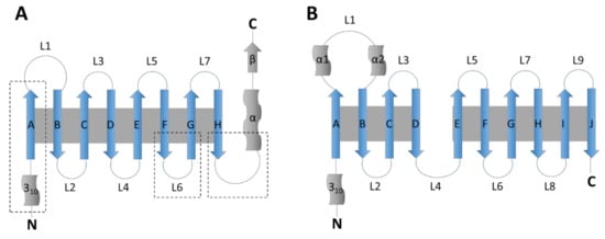 Schematic structures of the lipocalin and fatty acid binding protein family (adapted from [4]). (A) Lipocalin structure. The β-strands forming the β-barrel are represented as arrows labeled A–H and the loops as circular lines labeled L1–L7. The short N-terminus 310-helix and the C-terminus α-helix and short β-strand are also represented. Grey background represents hydrogen bonds between strands. Dotted squares surround the three structurally conserved regions of kernel lipocalins. (B) Fatty acid binding protein structure. The β-strands are represented as arrows labeled A–J and the loops as circular lines labeled L1–L9. Two conserved α-helixes in loop L1 are shown as α1 and α2. The N-terminus 310-helix and the C-terminus are also represented. Grey background represents hydrogen bonds between strands.