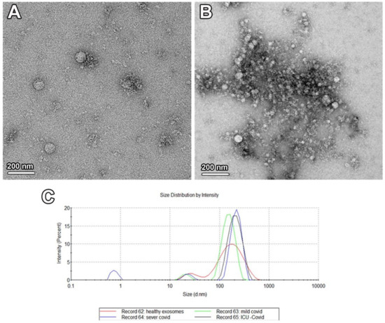 TEM examination for EVs extracted from the serum of COVID-19 patients and healthy controls revealed the presence of nanovesicles of different sizes (Figure 1A,B). The size of these exosomes ranged from 90 to 250 nm in diameter, as detected by NanoSight (Figure 1C).
