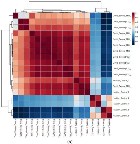 Among the total number of rationally adjusted EV metabolites in this study, 95 metabolites were found to be significantly (p < 0.05) modulated: either up- or down-regulated in COVID-19 patients when compared with healthy controls. Among these identified metabolites, 29 (upregulated) and 66 (downregulated) were found to be statistically significant in COVID-19 patients’ EVs when compared with healthy control EVs (Supplementary Table S2). Next, we plotted metabolites based on self-correlations by using the total number of rationally adjusted metabolites and found a significant correlation coefficient among the identified metabolites (Figure 3A). Further, using the total number of rationally adjusted metabolites, we created a hierarchical cluster analysis (HCA) heatmap and found that the COVID-19 patient samples were well-clustered separately from healthy controls (Figure 3B).