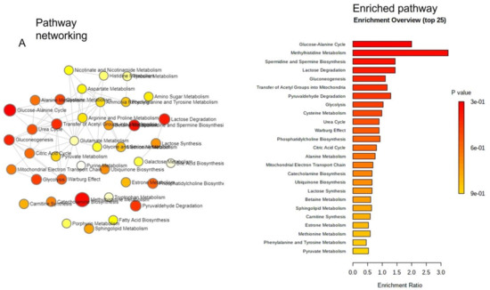 The web-based R-package MetaboAnalyst 3.0 (https://www.metaboanalyst.ca/faces/home.xhtml (accessed on 24 September 2021)) was used to analyze metabolomics pathways [72].