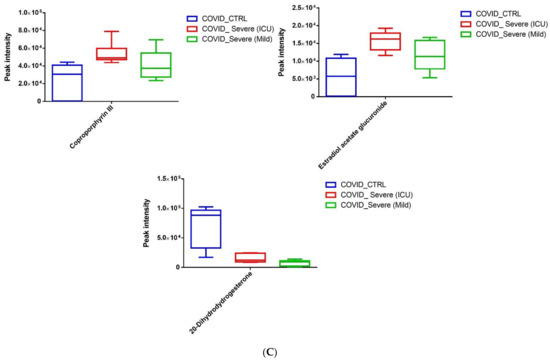 (A–C) Quantitative levels of statistically significant metabolites (p < 0.01) found to be upregulated in COVID-19 EVs when compared to healthy samples. Data are presented as box plot, median, and interquartile range (n = 3/group).