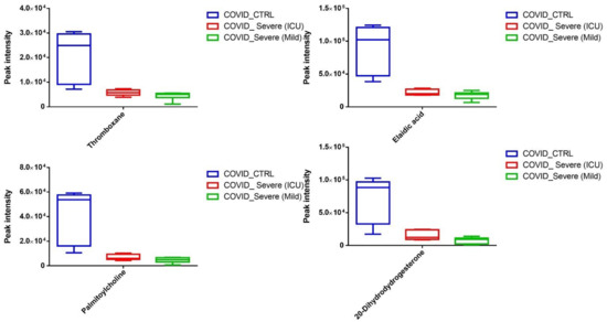 Next, we segregated the statistically significant downregulated EV-associated metabolites and identified thromboxane (a coagulant factor), elaidic acid (an unsaturated fatty acid that has been shown to modulate inflammatory responses), and palmitoylcholine (a phospholipid that plays a crucial role in cell signaling and communication). Further, we observed a significant decline in 20-Dihydrodydrogesterone (DHD), known to modulate endothelial nitric oxide, in EVs of COVID-19 patients when compared to EVs of healthy controls (Figure 7). In addition, we also noticed a significant reduction in many metabolites whose systemic and physiological impacts are still not well-known (Supplementary Table S2).