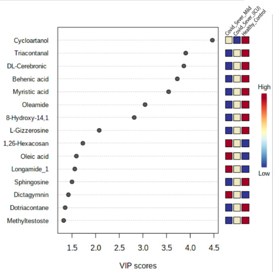 Finally, we sought to learn whether any metabolite or group of metabolites might be considered as COVID-19-specific. For this, we performed the variable importance in projection (VIP) score, and 15 EV metabolites were found to be responsive towards the variation between COVID-19 patient samples and healthy control samples (Figure 8). Among the metabolites that discriminated COVID-19 patient samples from healthy controls were four upregulated metabolites, namely oleic acid, 1,26-hexacosanediol, longamide, and dictagymnin, belonging to different metabolic pathways and suggesting a clear alteration in the respective pathways.