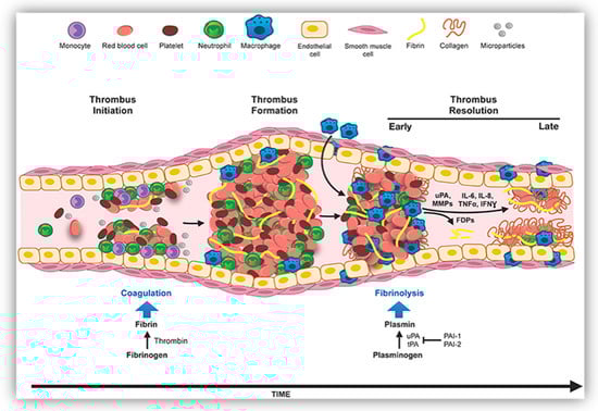 - Mukhopadhyay, S.; Johnson, T.A.; Duru, N.; Buzza, M.S.; Pawar, N.R.; Sarkar, R.; Antalis, T.M. Fibrinolysis and Inflammation in Venous Thrombus Resolution. Front. Immunol. 2019, 10, 1348. [Google Scholar] [CrossRef]