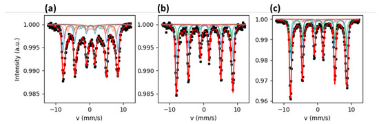 We fitted our spectra using six sextets, keeping the ratio between the resonance lines as 3:2:1. Depending on the overall resonance line widths, the sites were grouped by constraining the isomer shift and allowing different values of magnetic hyperfine field BHF. The larger the line width, the larger the number of sites per isomer shift value. The spectra and their fits are shown in Figure 2, and the corresponding hyperfine parameters obtained from the fits are reported in Table 1.