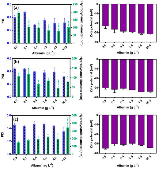 Influence of increased concentrations of albumin on the physicochemical data of (a) Fe3O4 NPs, (b) Fe3O4@Ag NPs, and (c) Fe3O4@Ag/TCS NPs. Results show the values of hydrodynamic diameter (nm), measured in percentage of number, polydispersity index (PDI), and zeta potential (mV). * p < 0.0360, ** p < 0.0024, and **** p < 0.0001, calculated using two-way ANOVA.